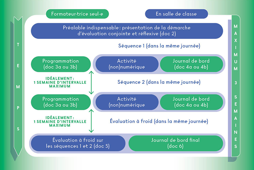La structure de la démarche d’évaluation conjointe présentée dans le schéma ci-dessus s’accompagne de divers documents nécessaires à sa mise en œuvre, comme les journaux de bord, un modèle de programmation des activités pédagogiques, des explications concernant l’évaluation à froid, etc. Toute la documentation concernant le dispositif d’évaluation conjointe est à disposition en téléchargement libre17, ce qui permet à toute institution ou formateur·trice intéressé·e de la mettre en œuvre dans les cours.