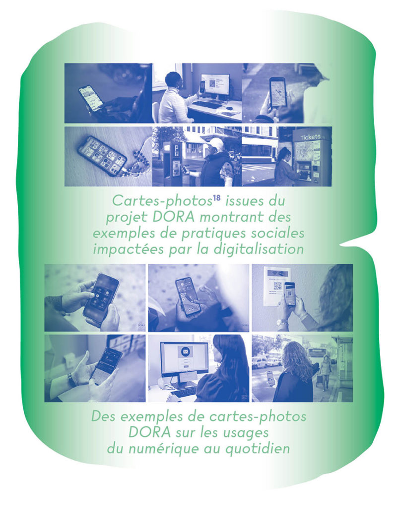 L’équipe de recherche du projet DORA a également conçu un set de 65 cartes-photos illustrant des situations numériques du quotidien, en réponse aux besoins exprimés lors des focus groups et aux remarques des partenaires institutionnels. Cette initiative a été rendue possible grâce à la mobilisation active de différents acteurs. Les cartes servent de support à la parole des apprenant·es adultes, facilitent l’expression sur les usages, les stratégies et les difficultés en lien avec le numérique et offrent un outil actuellement peu exploité dans le champ de la formation numérique de base. Distribuées gratuitement à de nombreuses institutions de Suisse romande, elles peuvent être mobilisées en début, pendant ou en fin de cours pour identifier les besoins, structurer les apprentissages et enrichir l’échange pédagogique. Un premier bilan sur leurs usages montre une grande variété d’utilisations, allant des ateliers-conseil à l’évaluation finale des compétences, ce qui atteste du succès du dispositif comme levier contre la fracture numérique chez les adultes en formation.
