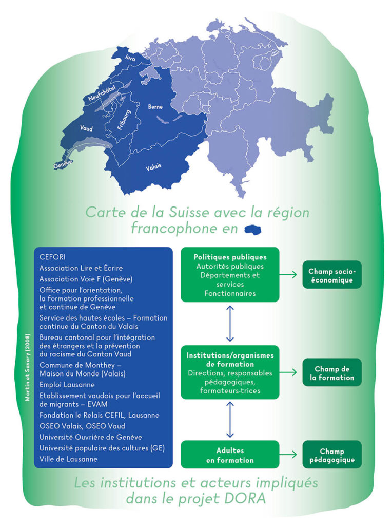 La démarche DORA s’est inscrite dans une approche de recherche-action, « un processus destiné à doter tous les participants de la scène éducative (…) des moyens d’améliorer leurs pratiques grâce à leurs expériences éclairées et nourries des savoirs théoriques en cours. »[6]. DORA a également été conçue comme une démarche participative, dans la mesure où les objectifs, les axes de travail, la méthodologie, le plan et les questions de recherche ont été définies de manière collaborative avec les représentant·es de onze institutions actives dans le domaine de la formation de base, des prestataires de formation et des autorités publiques (financeurs des formations).