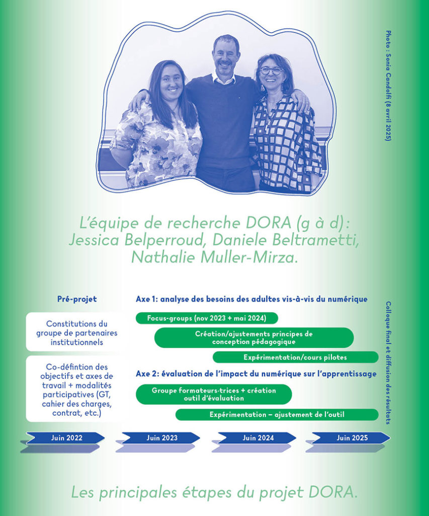 Le projet de recherche DORA a été une expérience de recherche-action riche et partagée entre plusieurs acteurs de la formation des adultes en compétences de base. La co-construction des objectifs, de la méthodologie, des activités et des résultats obtenus avec l’équipe de recherche de l’Université de Genève a soutenu l’implication active de divers professionnel·les et institutions. Cette participation active a permis de faire évoluer les pratiques et les représentations autour du numérique en formation, de son utilité et de son impact. Les diverses expérimentations concrètes ont permis à des institutions de modifier leur offre de formation. Les différents produits issus de ce projet se veulent comme autant d’instruments mis à disposition de toutes les personnes concernées par le sujet.